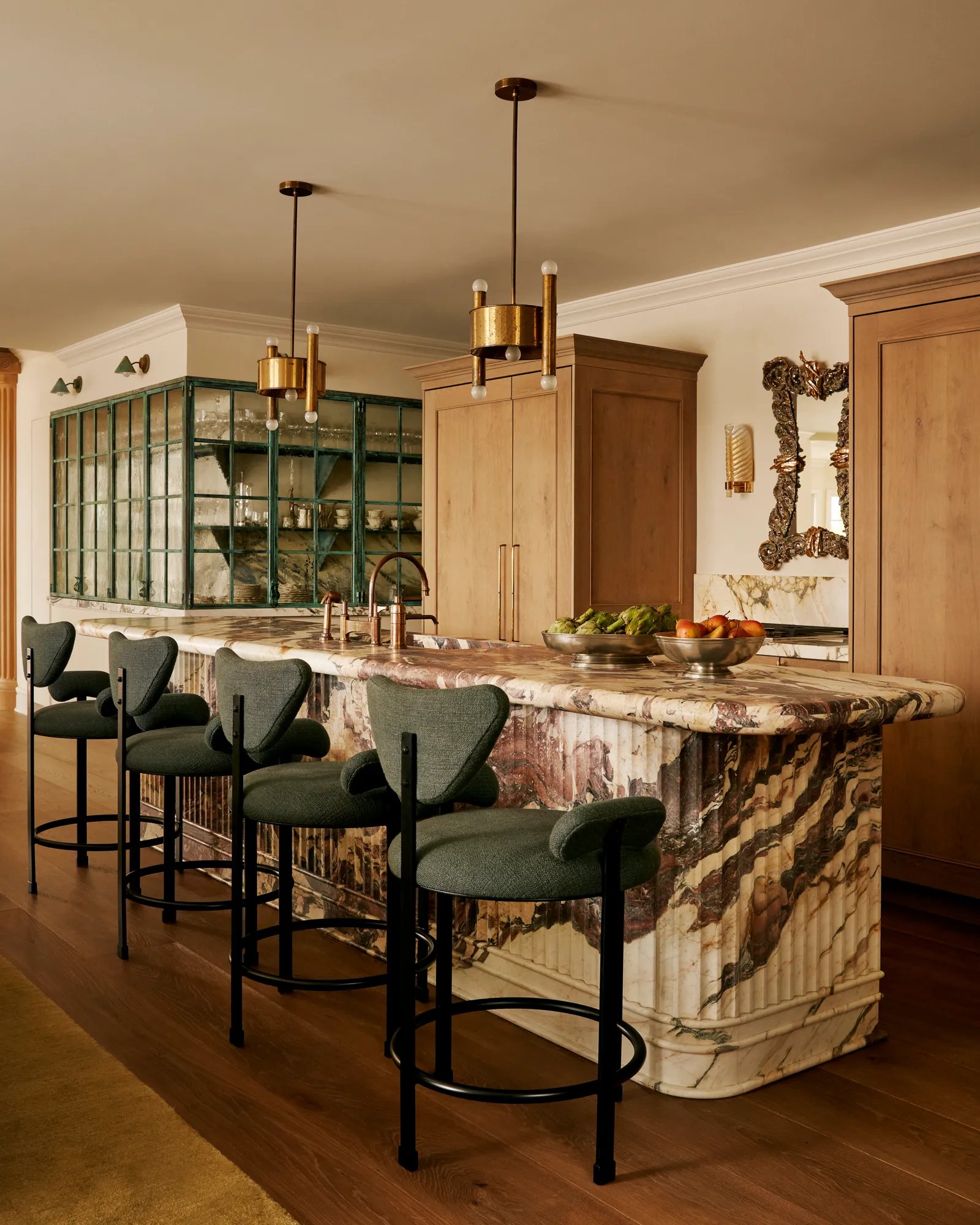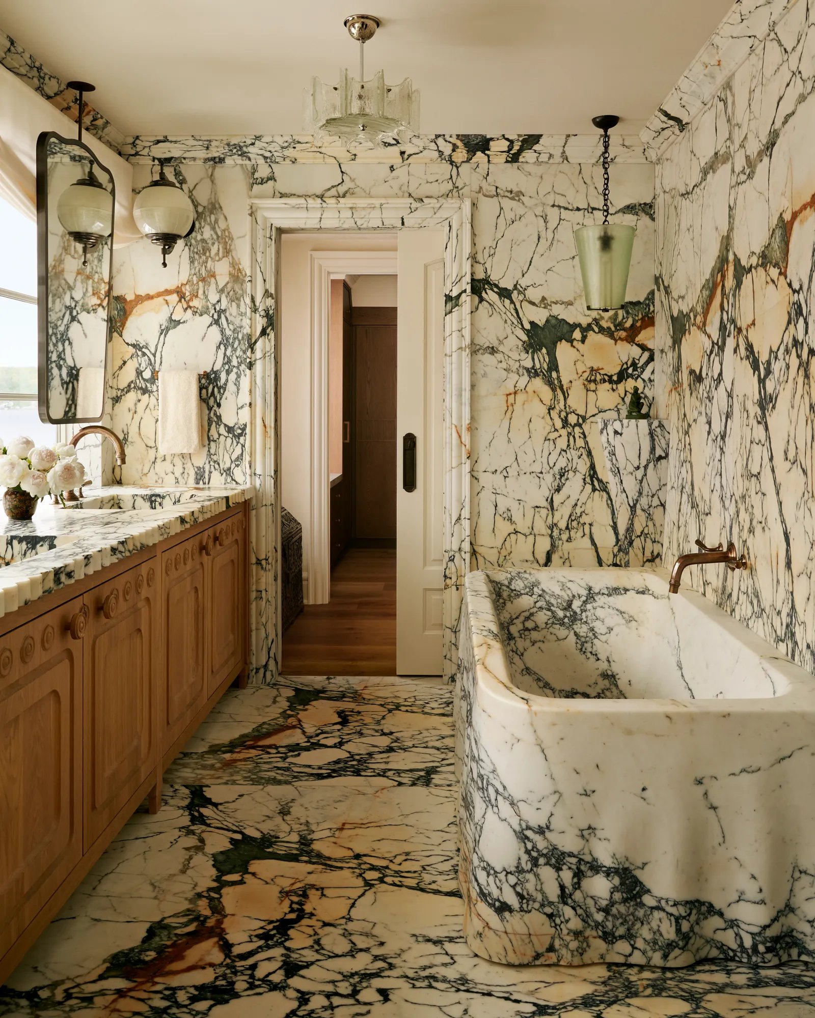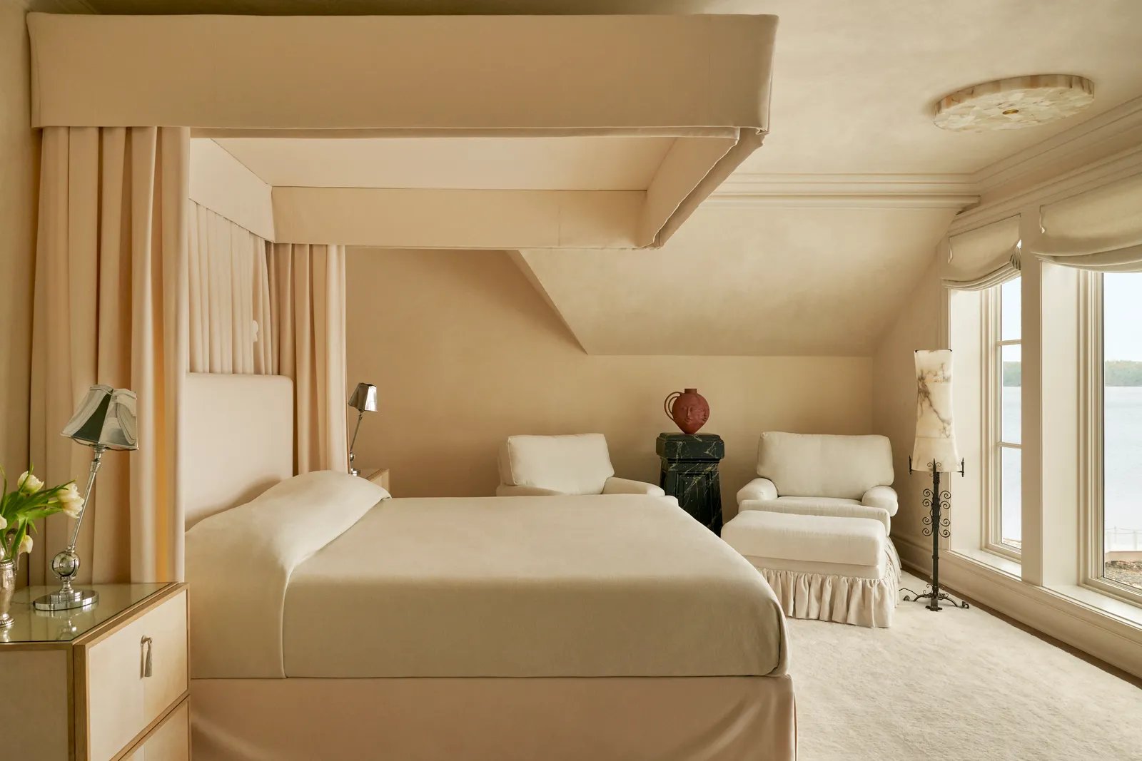 Among Sands’s many favorite places in the residence, now more conducive to cozy winter weekend getaways, is the couple’s shared second-floor office overlooking the lake. There, Brent suggested partial warped-wood walls with a reflective sheen—but because faux weathering can quickly veer into the contrived, local millworkers ARBR Studios tumbled the panels and struck them with keys, a hand-hewn addition that continues to make the homeowners smile. Nearby, the primary bedroom is another hideaway that Sands struggles to leave, with its plush creamy surfaces, including suede walls and a canopy bed. Yet the primary bath, where a parade of midcentury Italian and Austrian lighting sparkles against an expanse of dramatic Paonazzo marble, is somehow even dreamier.