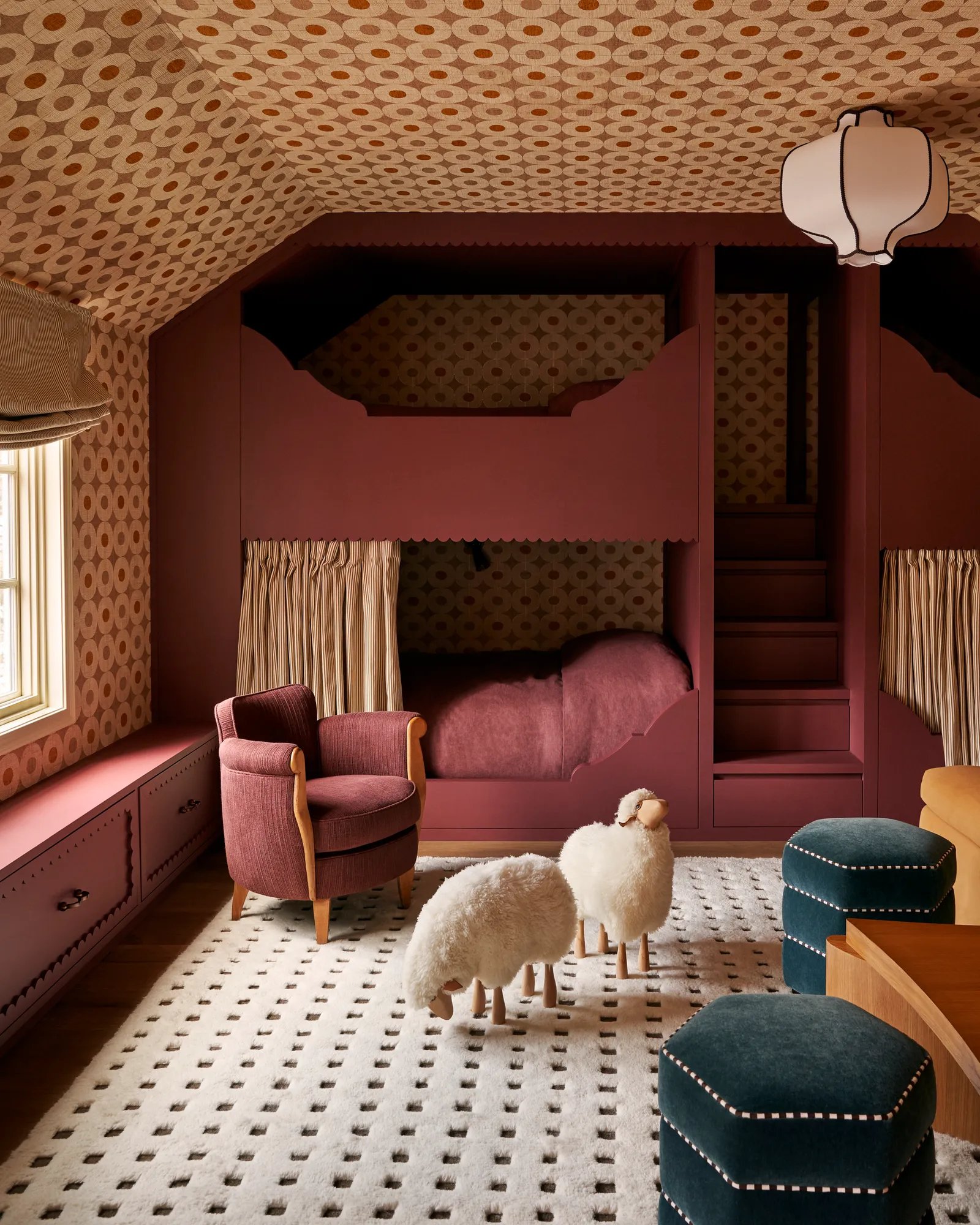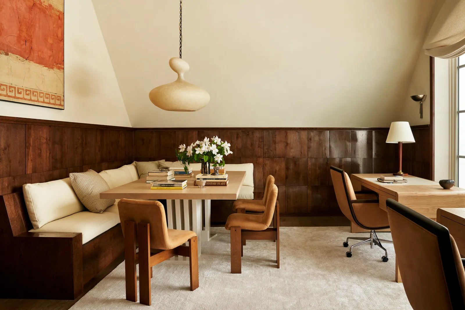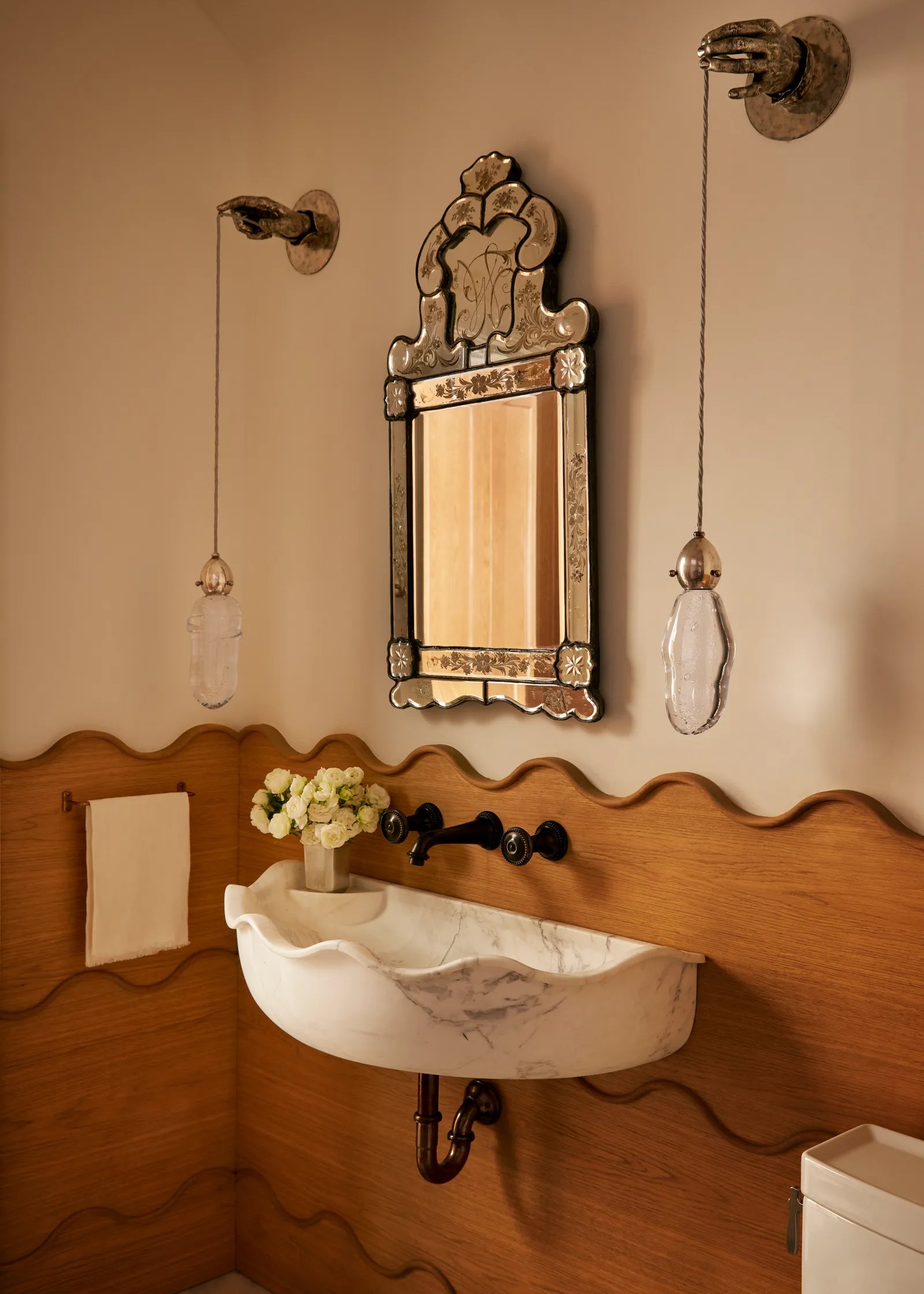 Among Sands’s many favorite places in the residence, now more conducive to cozy winter weekend getaways, is the couple’s shared second-floor office overlooking the lake. There, Brent suggested partial warped-wood walls with a reflective sheen—but because faux weathering can quickly veer into the contrived, local millworkers ARBR Studios tumbled the panels and struck them with keys, a hand-hewn addition that continues to make the homeowners smile. Nearby, the primary bedroom is another hideaway that Sands struggles to leave, with its plush creamy surfaces, including suede walls and a canopy bed. Yet the primary bath, where a parade of midcentury Italian and Austrian lighting sparkles against an expanse of dramatic Paonazzo marble, is somehow even dreamier.