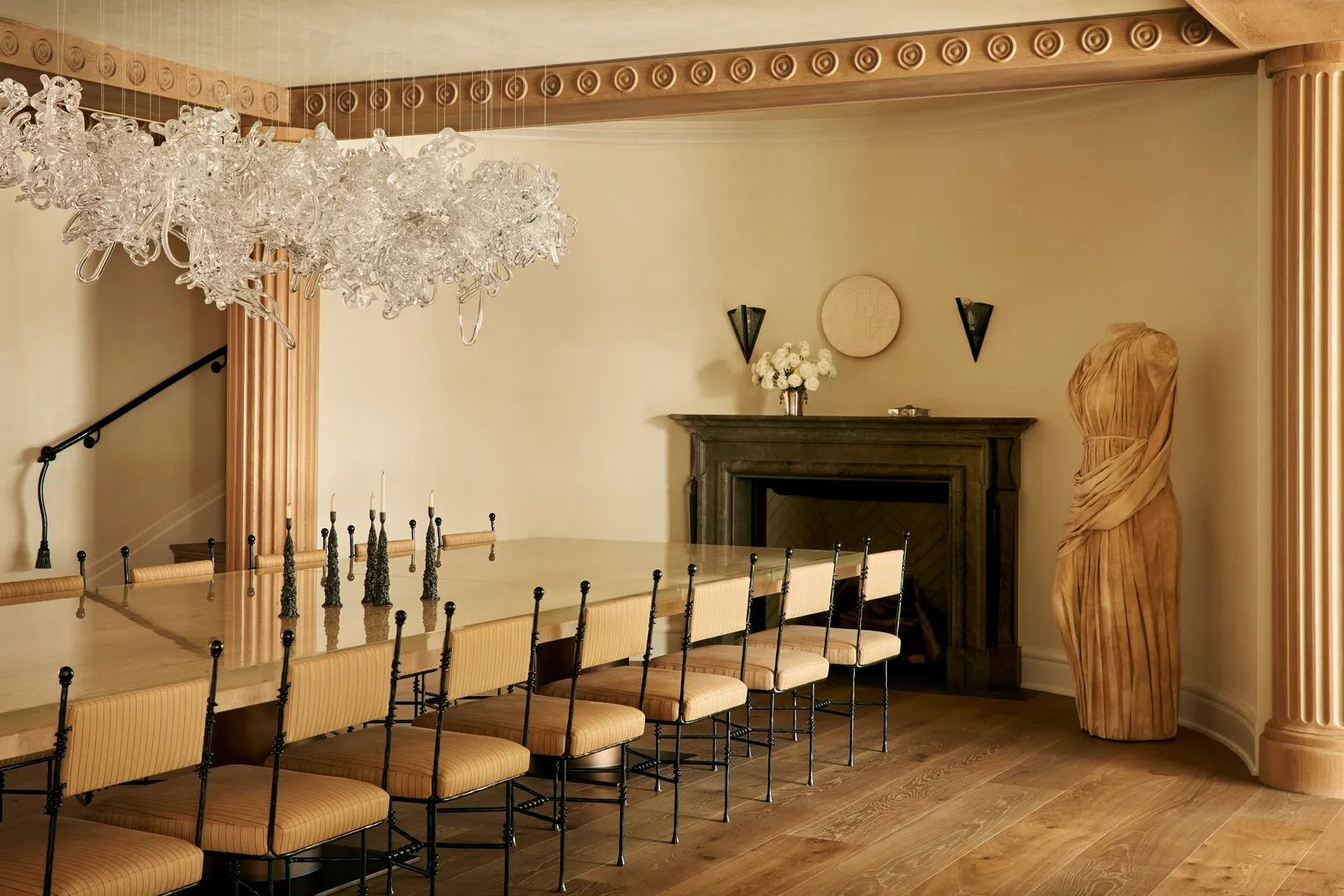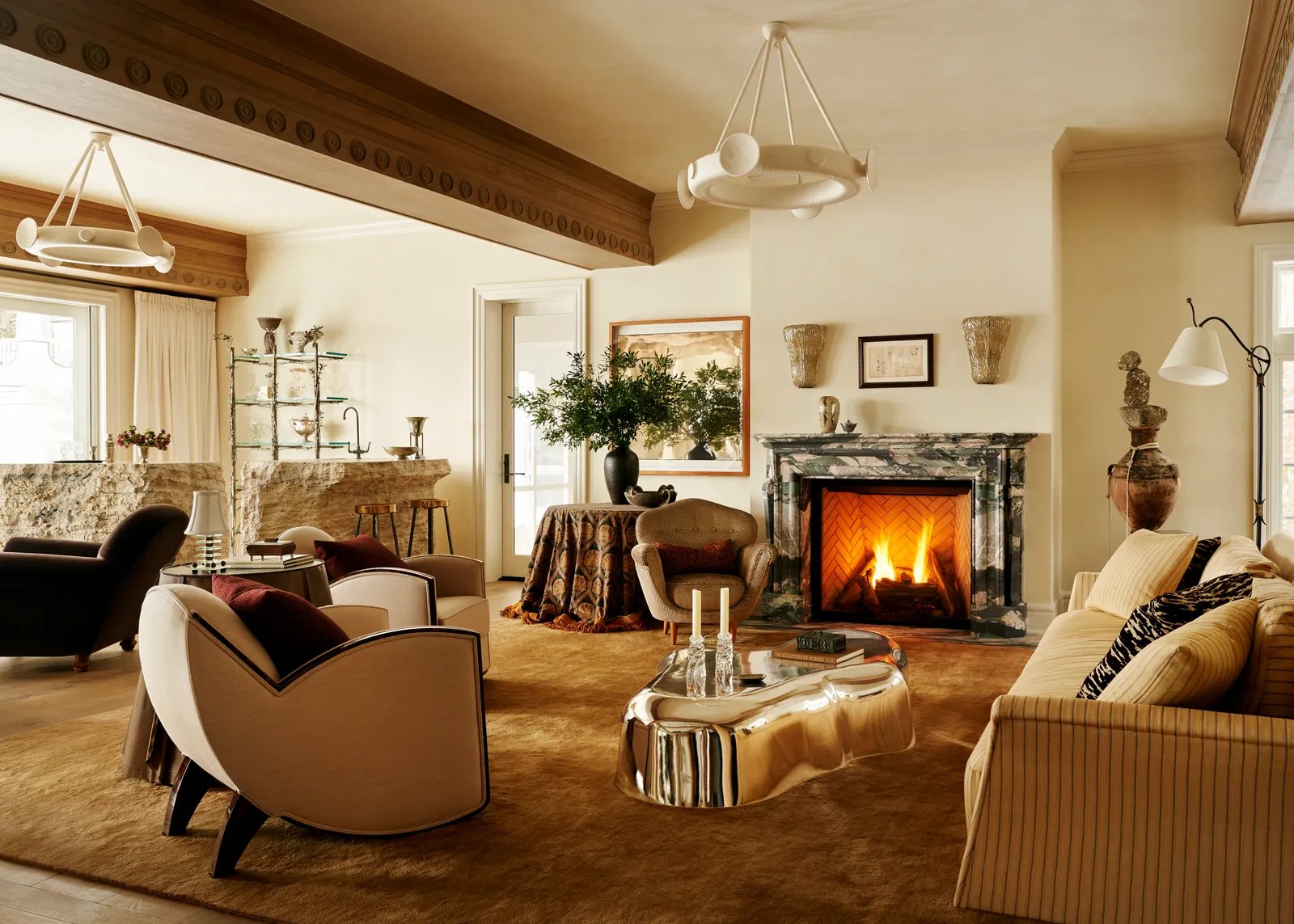 The resulting design concept for the project, which Brent calls “the harmony of reflection,” unsurprisingly works on many levels. The interior is not only a literal and figurative reflection of the exterior, where the family spends most of their time on the lake and grounds, but its new floor plan was conceived, Brent explains, by looking at the key moments in the family’s day as concentric ripples on water. Working with Hanlon Architects and DVC Incorporated contracting, the team gutted the interiors and moved three exterior walls to breathe new life into the circa-1990s, off-white-shingled edifice. Now, private and serene secondary spaces orbit focal gathering spots. It’s an idea further echoed in the home’s collection of art and objects: from the formal living room’s biomorphic chrome coffee table and the immense dining table, whose travertine top is carved with “waves” under a four-inch resin surface, to a spiral droplet motif lining the coffers and verdigris cabinets with water-like glass fronts.